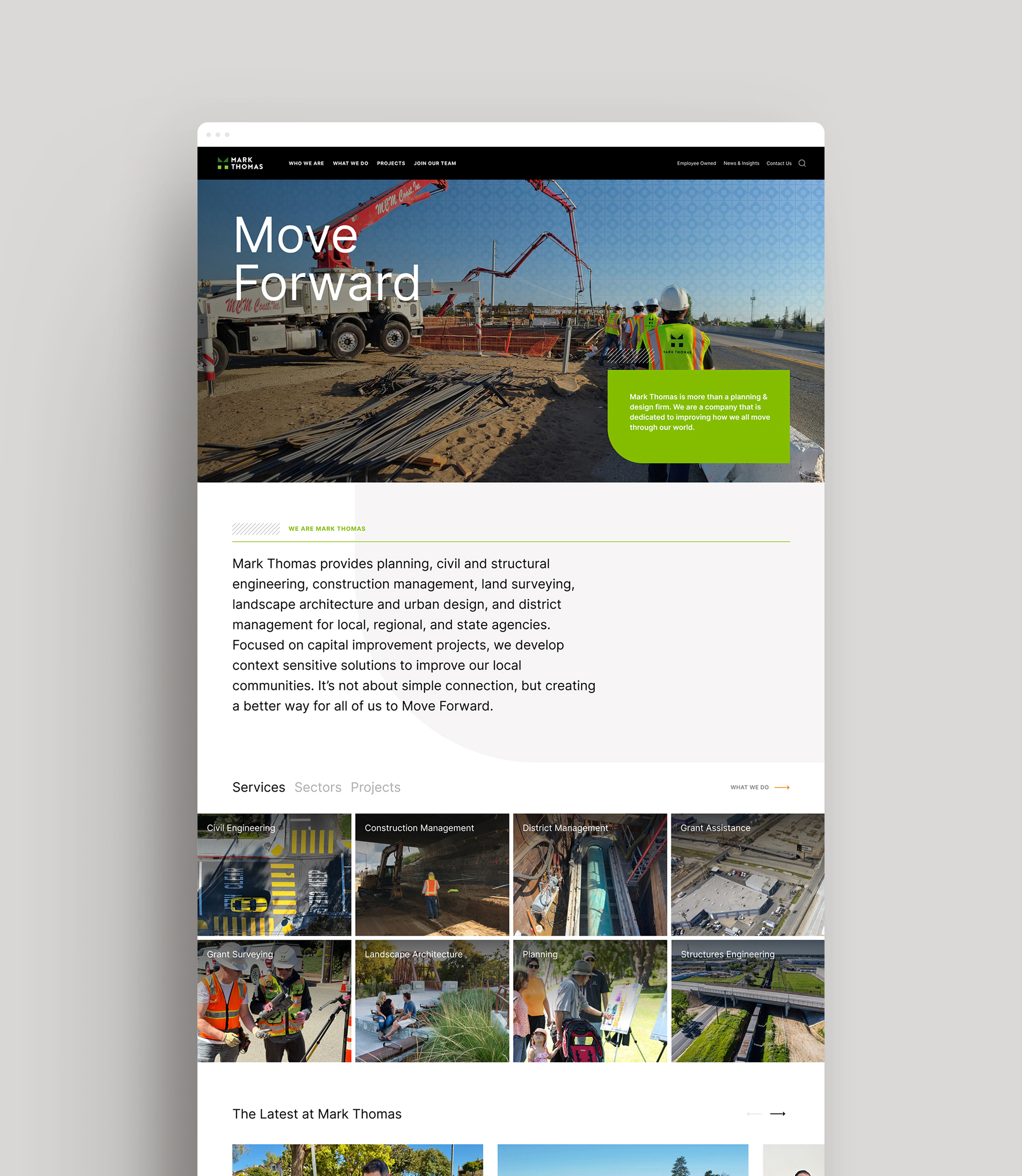 Mark Thomas provides integrated engineering and design services focused on improving local communities through thoughtful infrastructure solutions. To better reflect their established brand and enhance user experience, we were tasked with creating a new website that seamlessly applied their brand standards and introduced a content strategy built for clarity, flexibility, and ongoing updates.