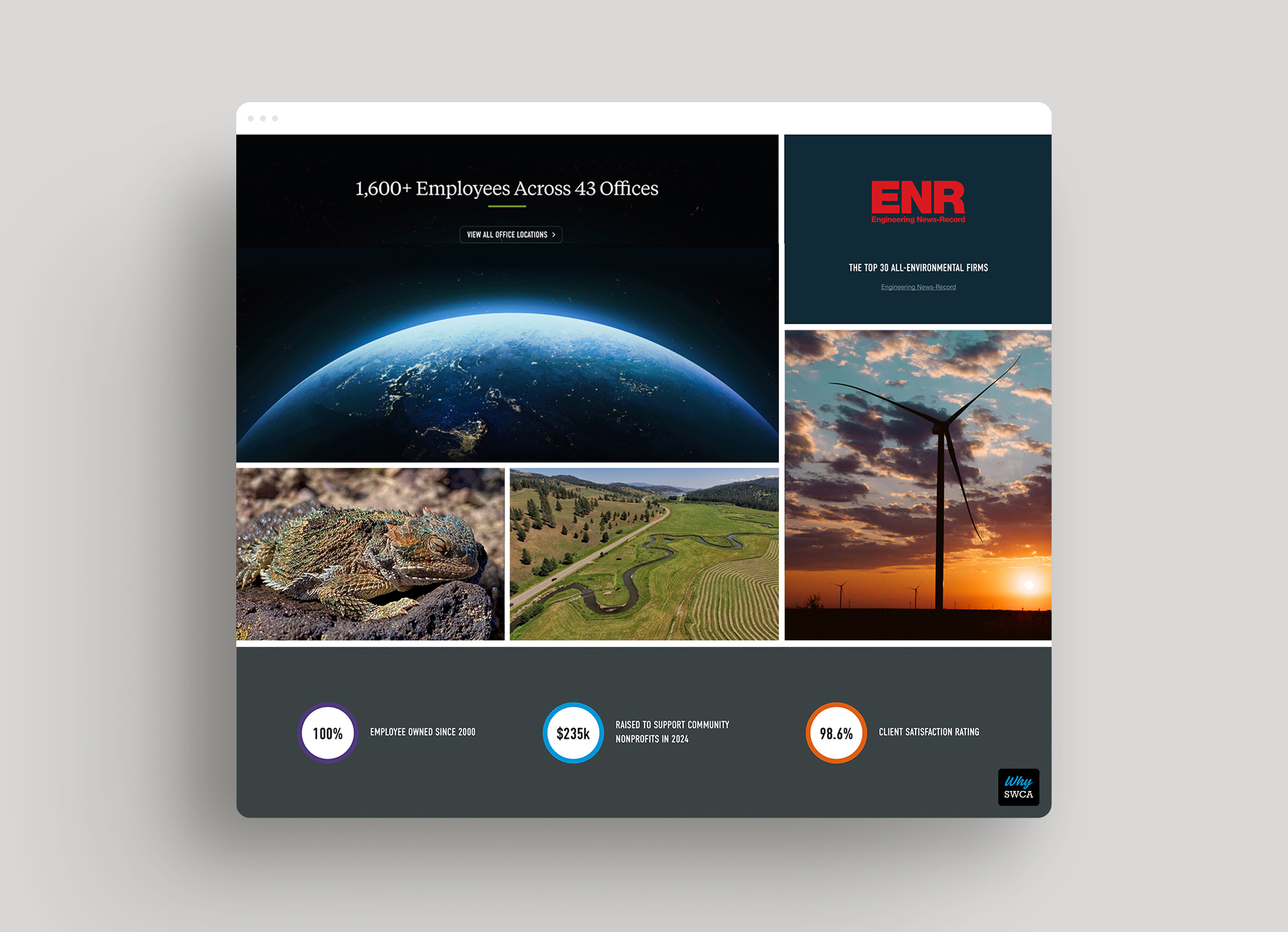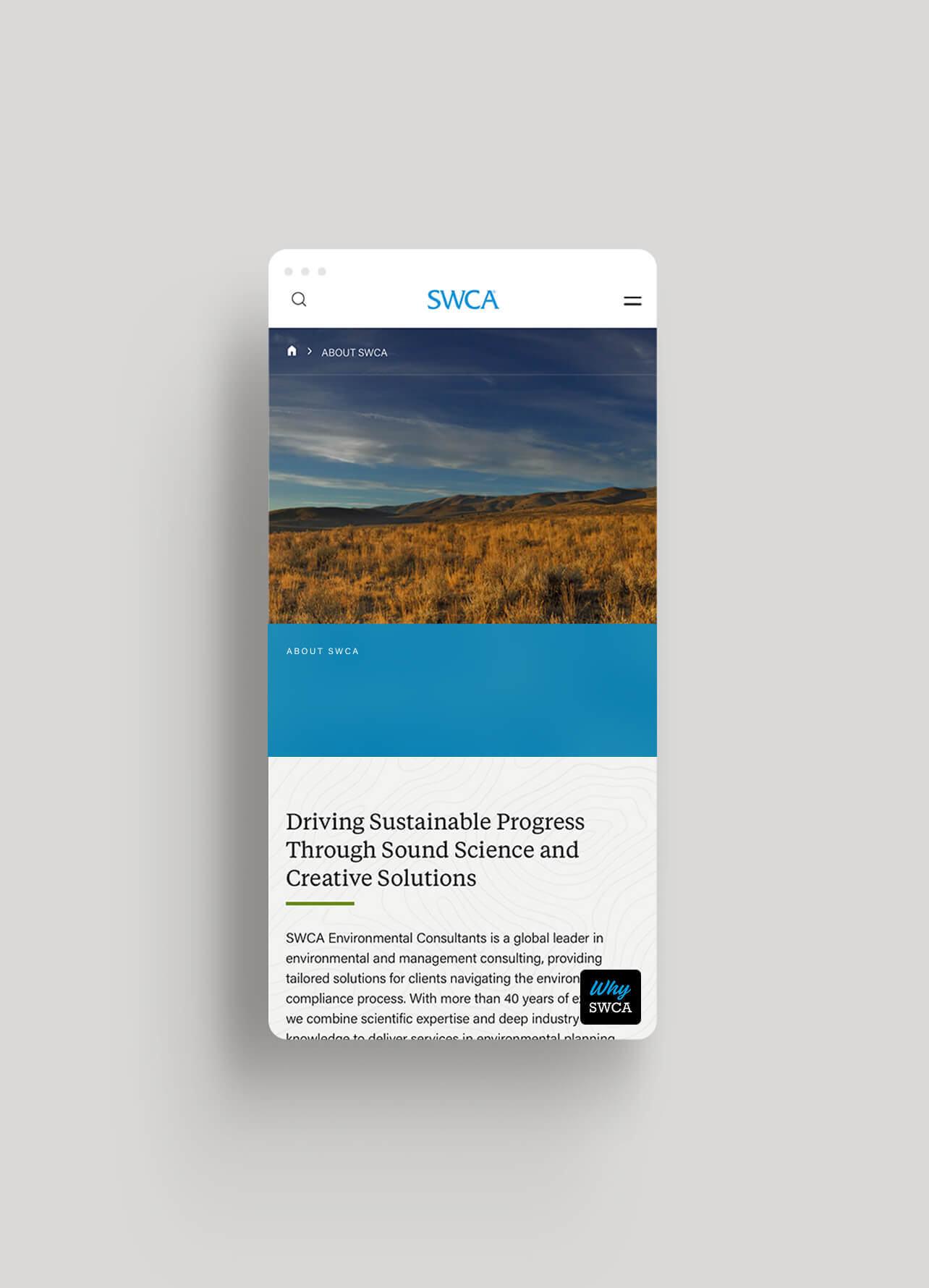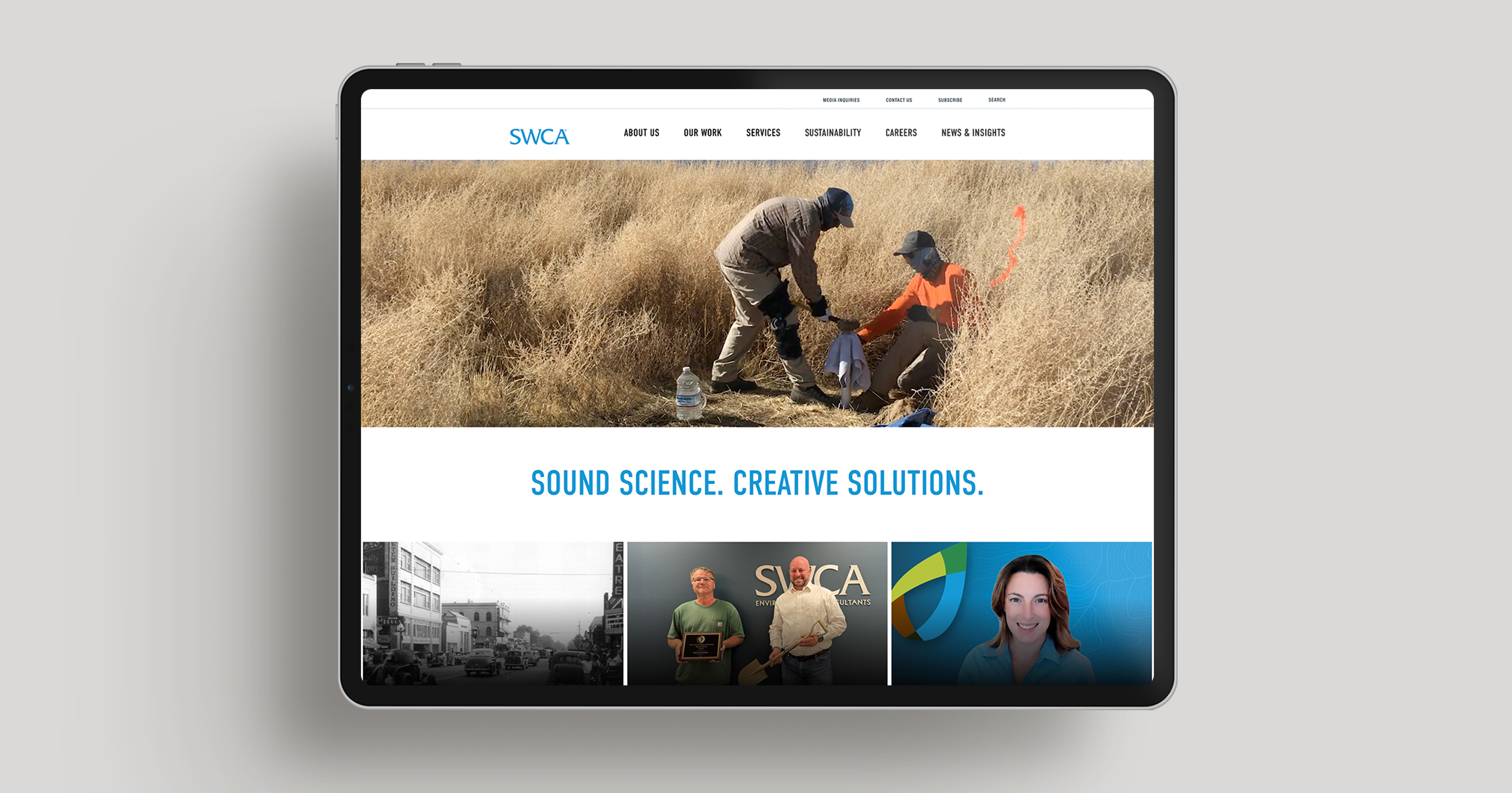 SWCA is a national leader in environmental and management consulting. With over 1,500 employees, they are purpose-driven by a mission to lead the industry in sustainability strategies. Their work spans environmental planning, cultural resource management, ecological services, and air and water quality consulting. To better align with evolving brand standards and support a more agile content strategy, SWCA needed a new website to be built within a WordPress architecture.