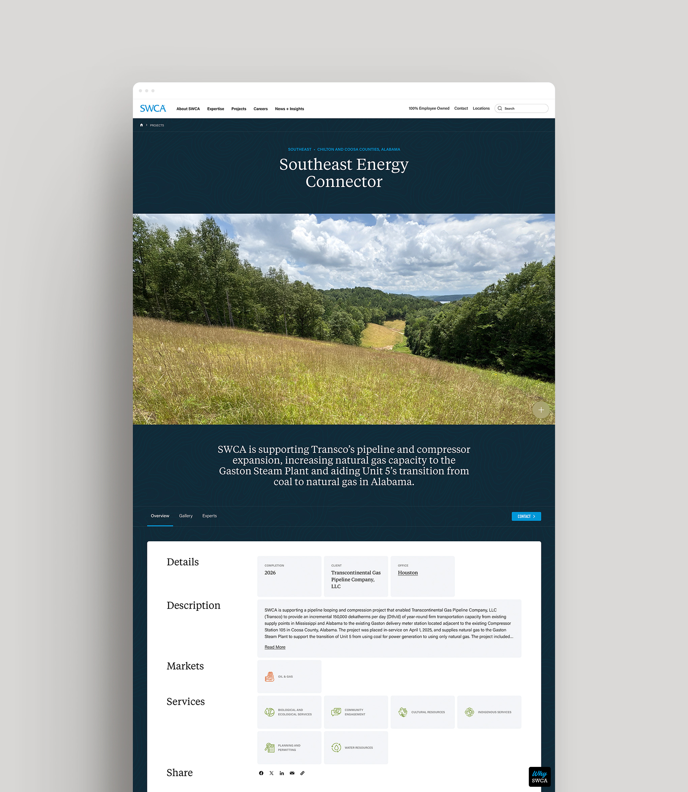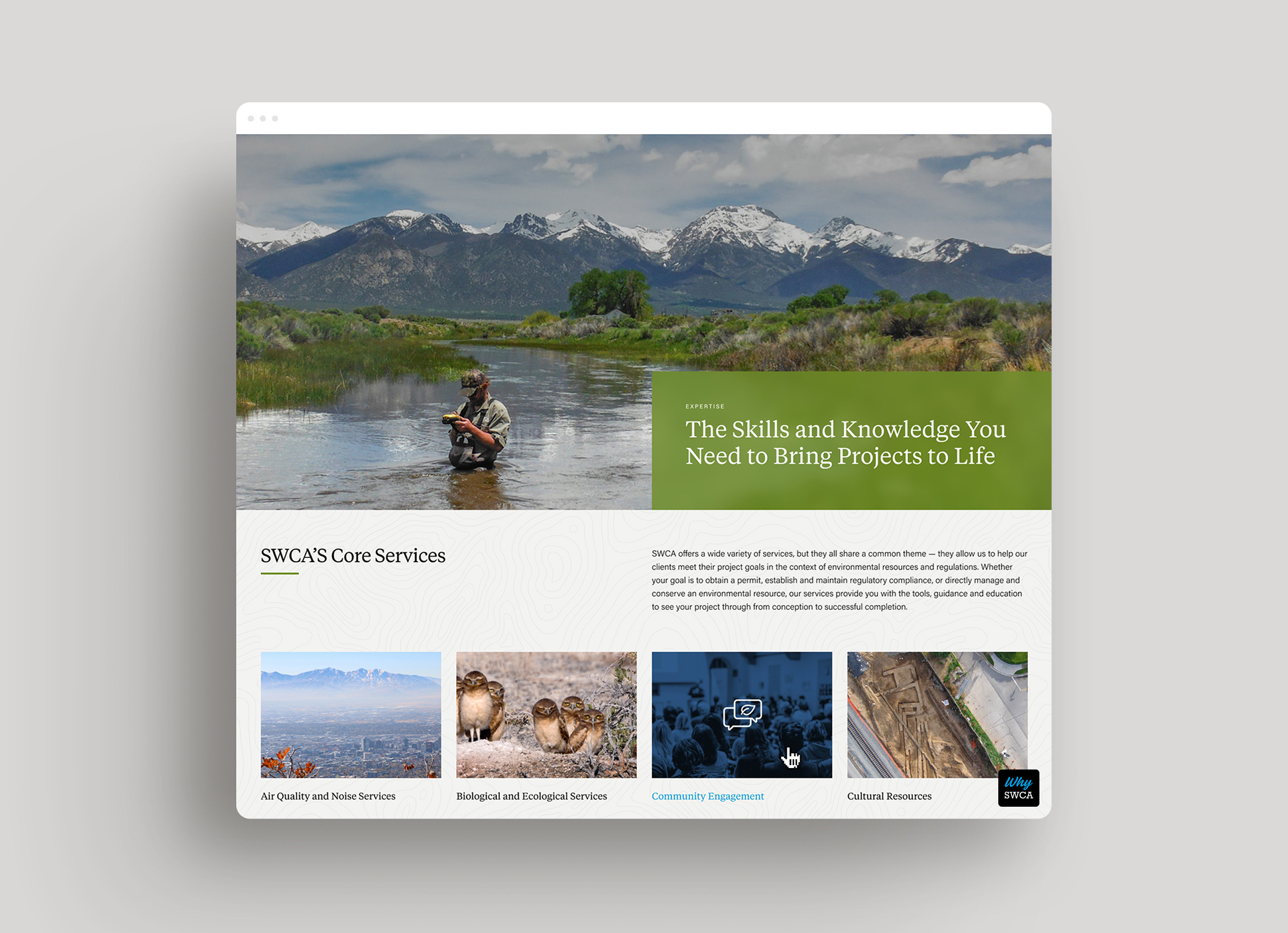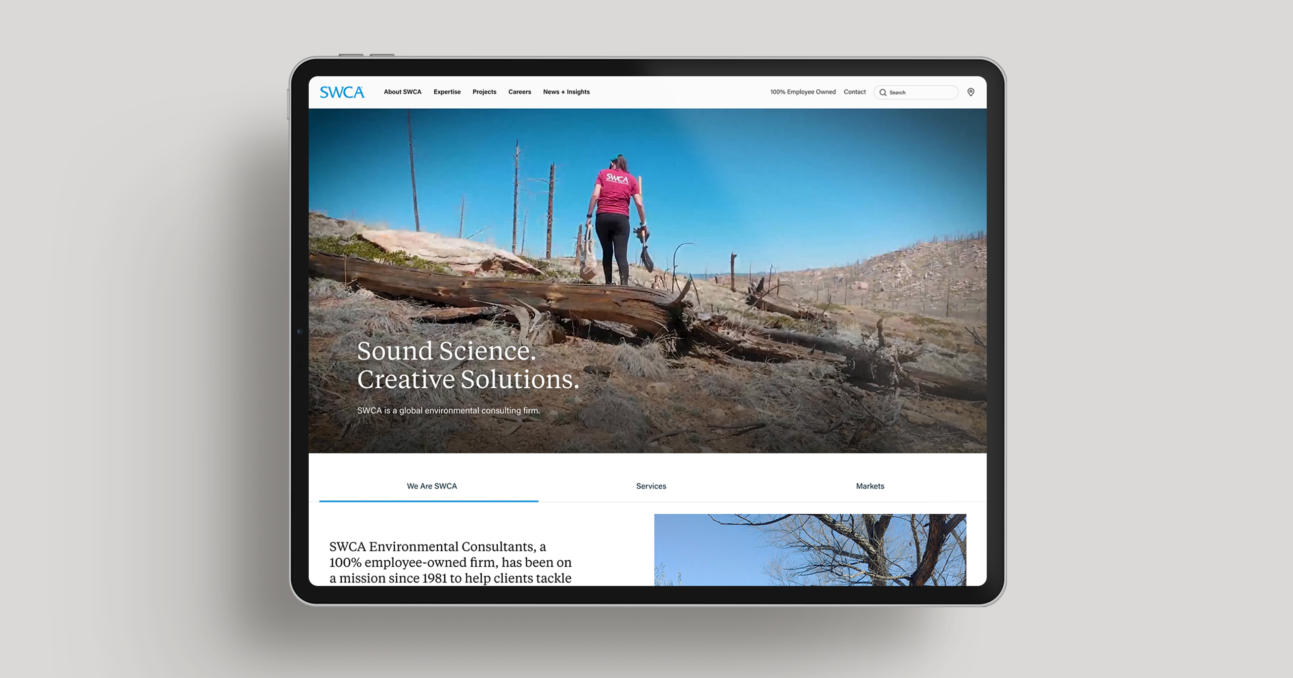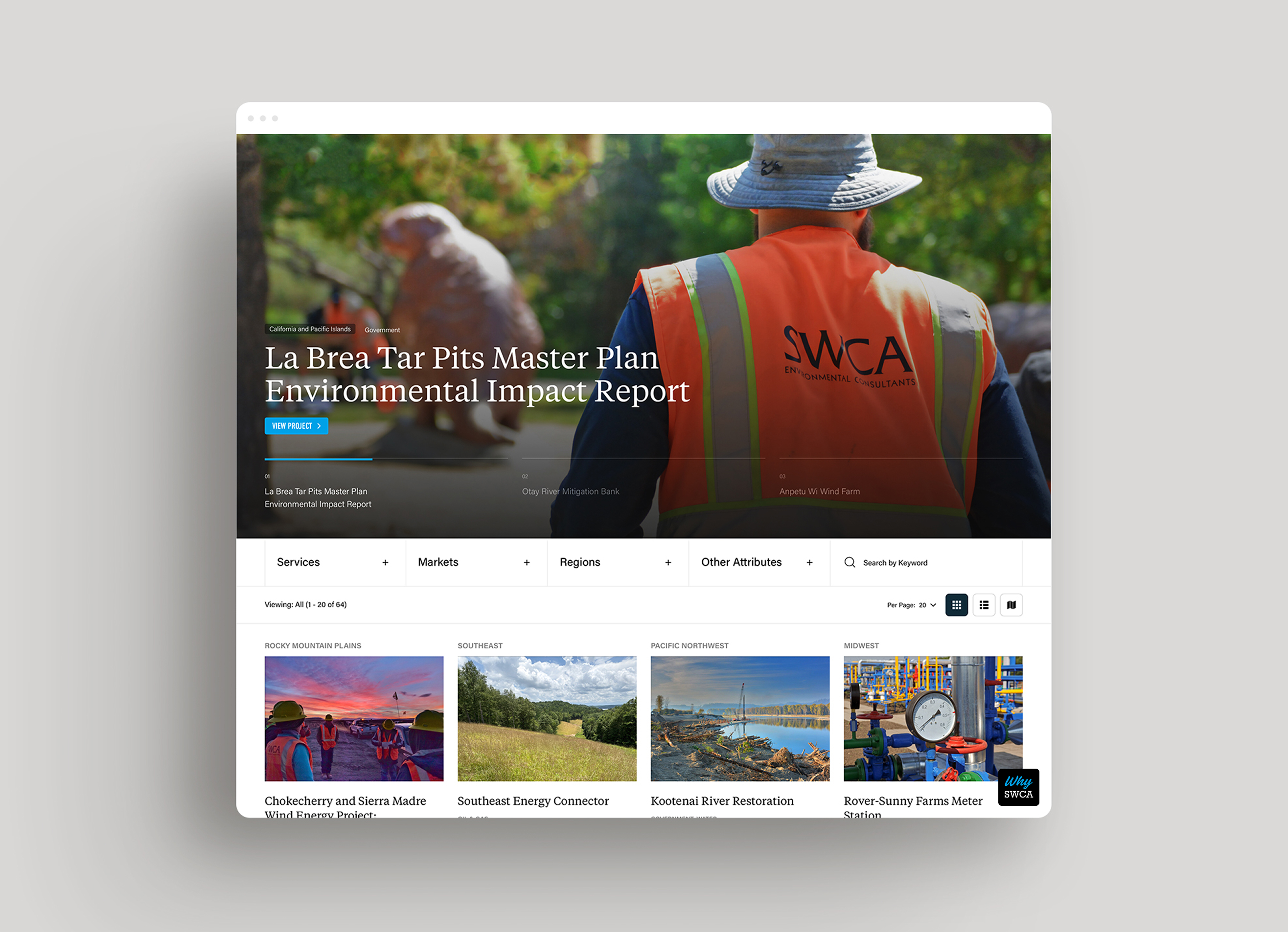 SWCA is a national leader in environmental and management consulting. With over 1,500 employees, they are purpose-driven by a mission to lead the industry in sustainability strategies. Their work spans environmental planning, cultural resource management, ecological services, and air and water quality consulting. To better align with evolving brand standards and support a more agile content strategy, SWCA needed a new website to be built within a WordPress architecture.