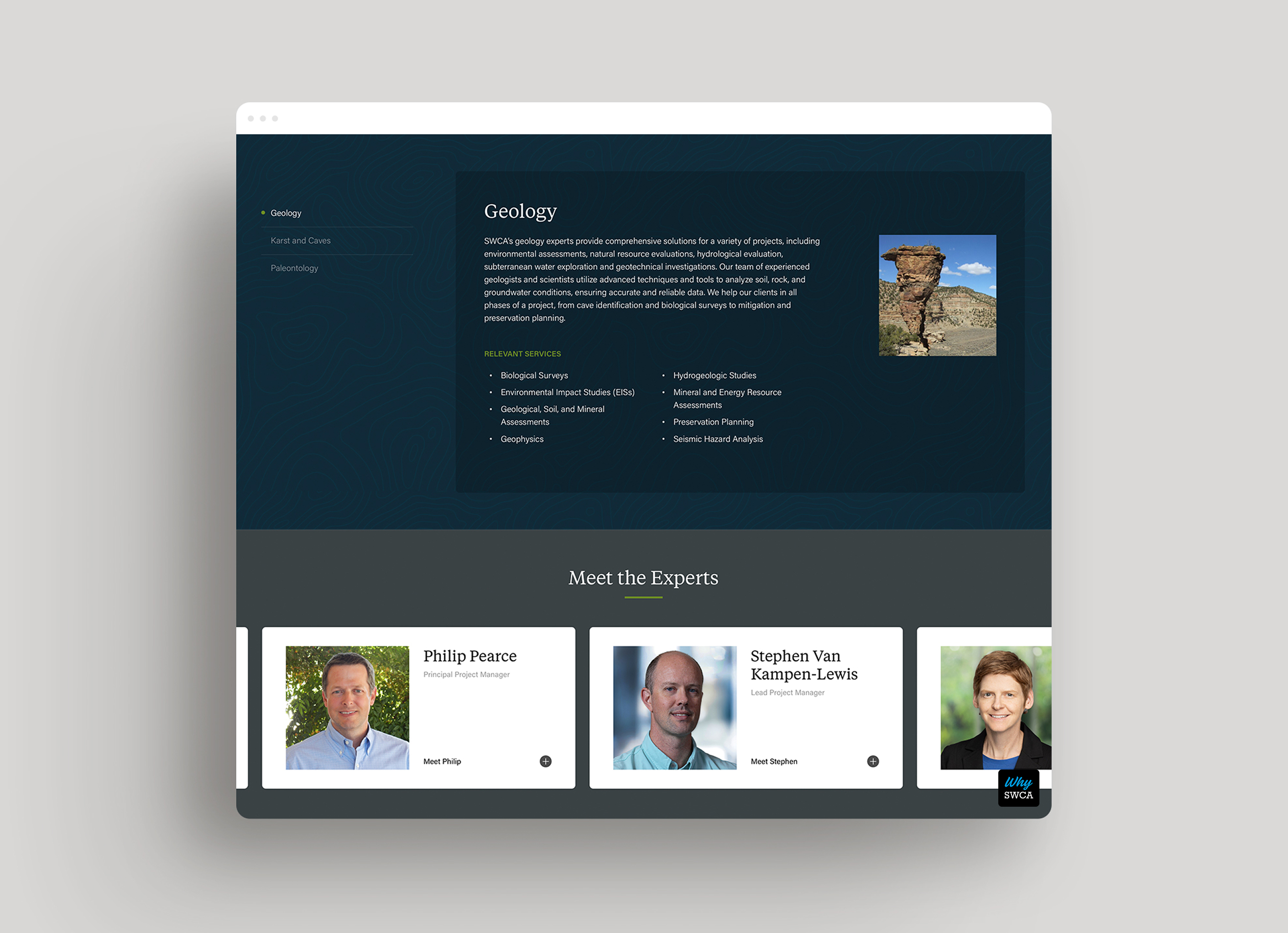 SWCA’s existing website, though rich in content, presented information in repetitive and fragmented ways. The structure made it difficult for visitors to explore the depth of the company’s expertise, and for internal teams to keep content fresh and consistently branded. They needed a digital platform that not only reflected their established identity, but also empowered their team to easily update and expand content within a more powerful CMS.